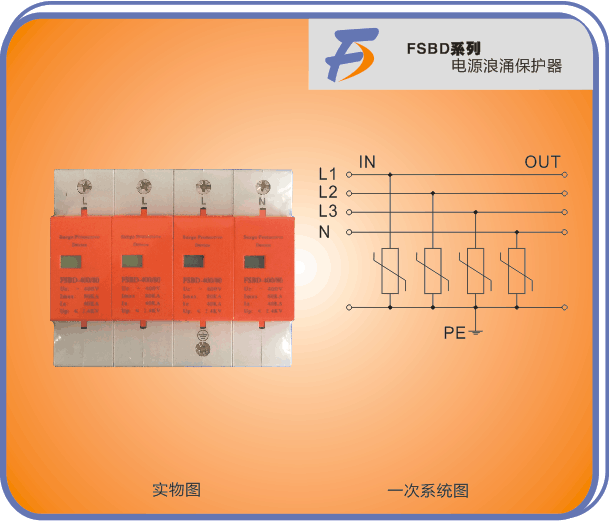 FSBD 系列浪涌保护器(又称电源防雷器、浪涌保护器、SPD)适用于50Hz的IT、TN-S、TN-C、TNC-S等供电系统中。它是由多个单片式标准电源防雷模块组成,可以自由组合成单相或三相保护,防止由于外界(雷击、电磁干扰等)或系统内部(系统拉合闸效应、感性及容性负载的启动和停止等)引起的脉冲浪涌及瞬间过电压对供电系统设备的损害。其内部核心元件采用优良的高能氧化物非线性严敏电阻,使其具有通流量大、承受过电压能力强、残压低、持续运行电压下漏电流小、使用寿命长等优点,同时具有脱离机构敏锐、响应速度快、安全可靠等优点。