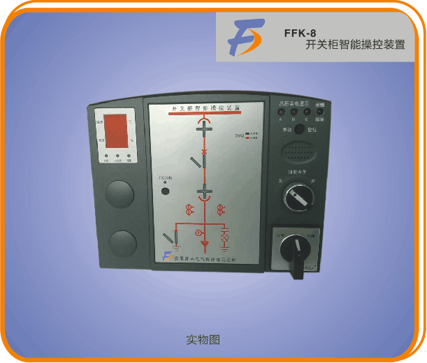 FFK-8系列智能操控装置适用于3~35KV系统户内中置柜、手车柜、固定柜、环网柜等多种开关柜,具有一次模拟图、带电显示、分合闸状态指示、接地开关指示、储能指示、手车位置指示、语音防误指示、温湿度数值显示、RS485远程通讯接口等多项功能。